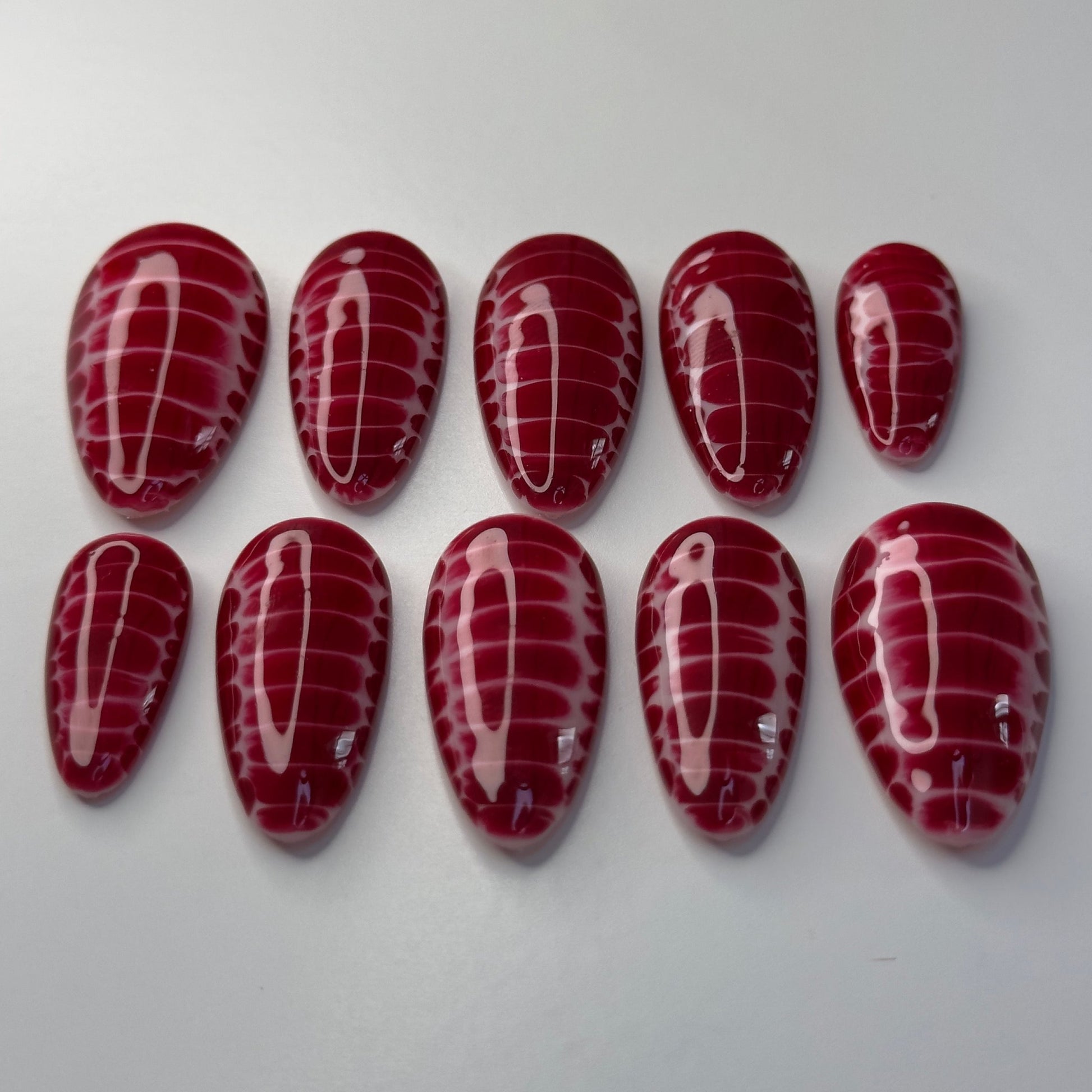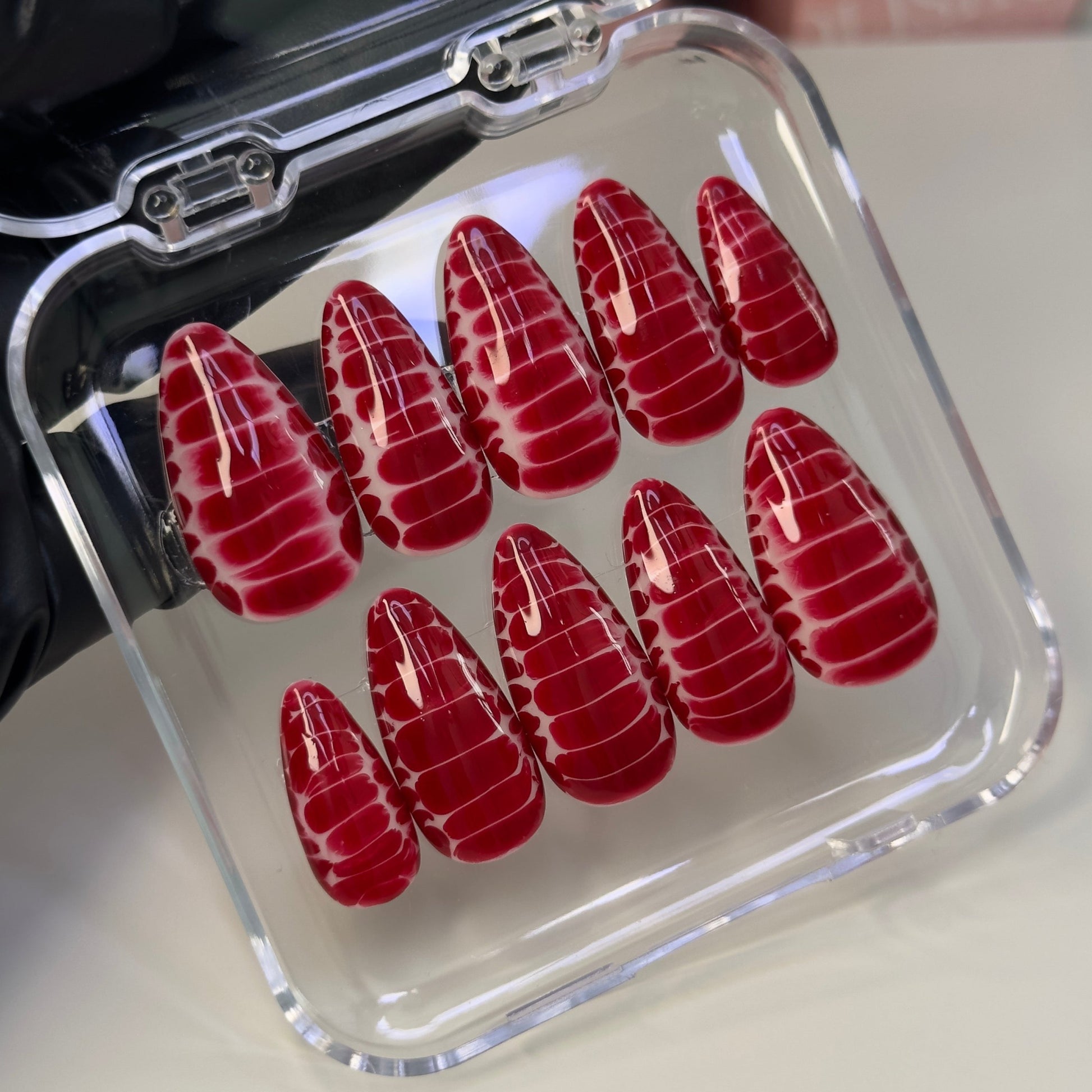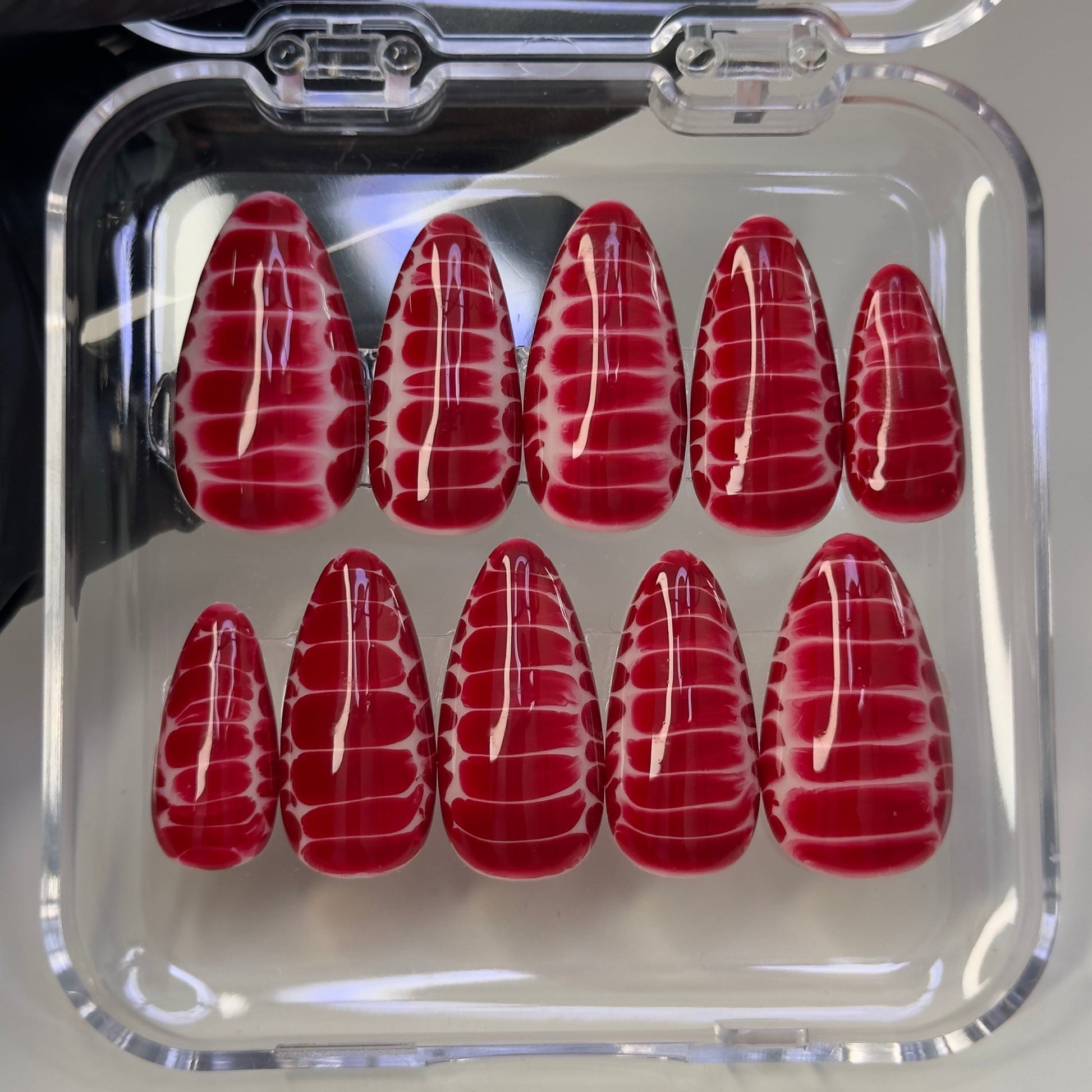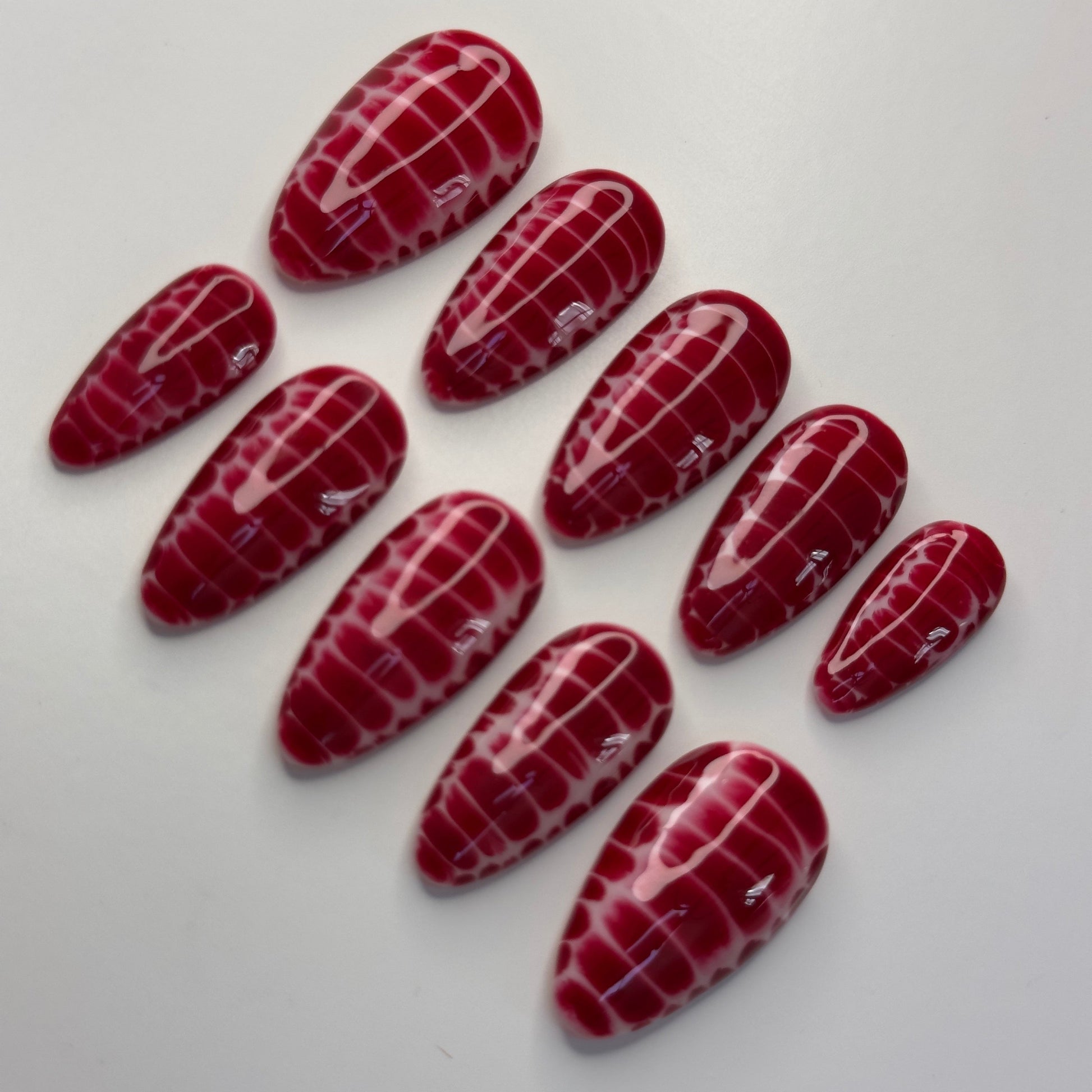 Prépare-toi à faire sensation avec ce set audacieux et sanglant ! “Croco Bloody” combine l’effet croco, une texture ultra tendance, avec une explosion de rouge écarlate. Un fond blanc éclatant est complètement noyé dans ce rouge intense, créant un contraste saisissant. C’est le genre de manucure qui ne passe pas inaperçue, idéale pour une touche de glamour un peu rebelle et un look hors du commun. Que ce soit pour un événement spécial ou juste pour affirmer ton style, ce set est là pour faire une déclaration.